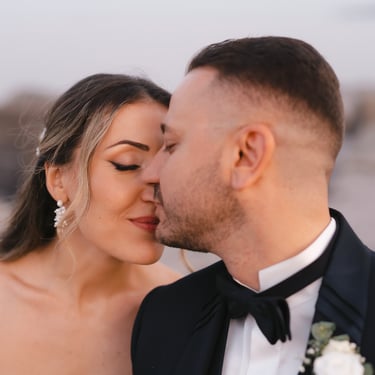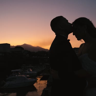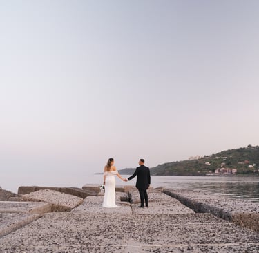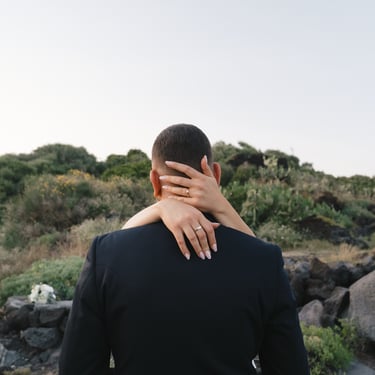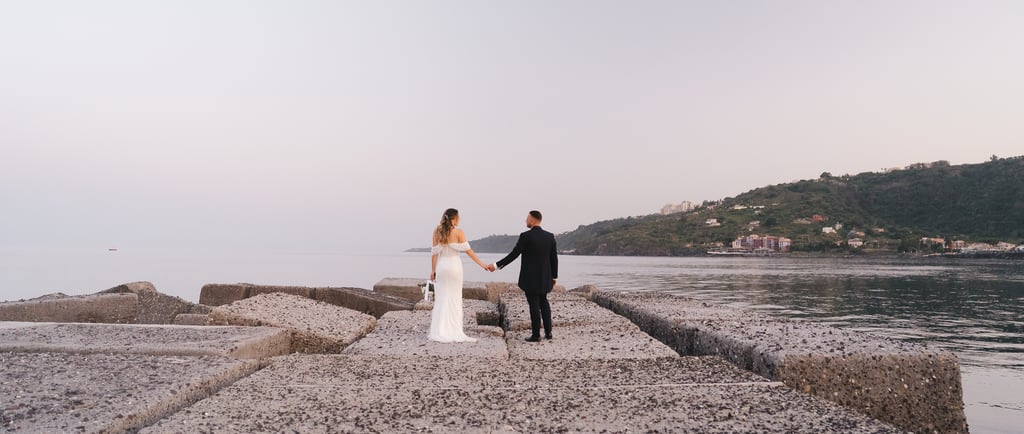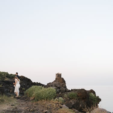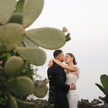 For the photo shoot we moved to Scalo Pennisi, which at sunset offers surprising scenery. The sky, turned pink in a few minutes, enveloped Alessia and Marco in a soft and romantic light, perfect for telling their bond with naturalness. It is in these moments that Sicily really offers the best, and the role of the wedding photographer becomes to tell what already exists: authenticity, complicity, truth.