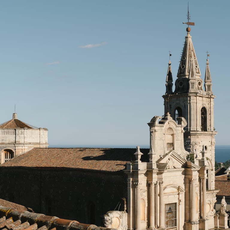 The ceremony was held in the majestic Acireale Cathedral, one of the most iconic places in the baroque city. After the yes, we moved to the bell tower of the Cathedral, from which an enchanting view of the roofs and squares of Acireale opens. It was an intimate and sincere moment, perfect to portray their complicity away from time.
