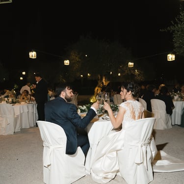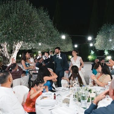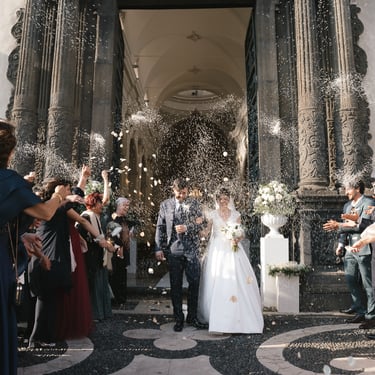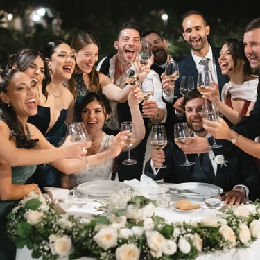 After the ceremony, the golden light of the afternoon accompanied them to the Gardens of Villa Fago, where the party exploded in a collective embrace. Glasses raised, laughter, music, friends. Everything was movement, life, shared happiness.